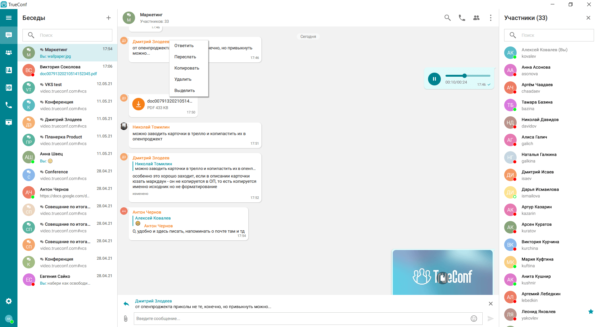 TrueConf Server V предназначен для организации групповых видеоконференций до 1500 пользователей в корпоративных сетях любой сложности и через интернет. Использование самых современных алгоритмов и технологий гарантирует непревзойденное качество связи и надежность работы системы.