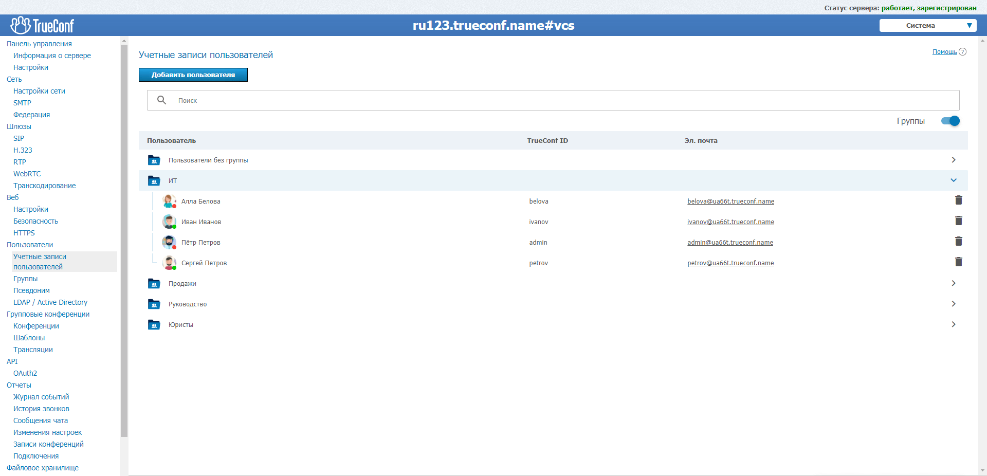 Все пользователи Труконф могут общаться друг с другом. При этом, неважно, на каком сервере они зарегистрированы. Даже пользователи TrueConf Online доступны для вызова. Вы полностью контролируете этот процесс и сами определяете доступ к вашему серверу для абонентов других серверов и сервисов.